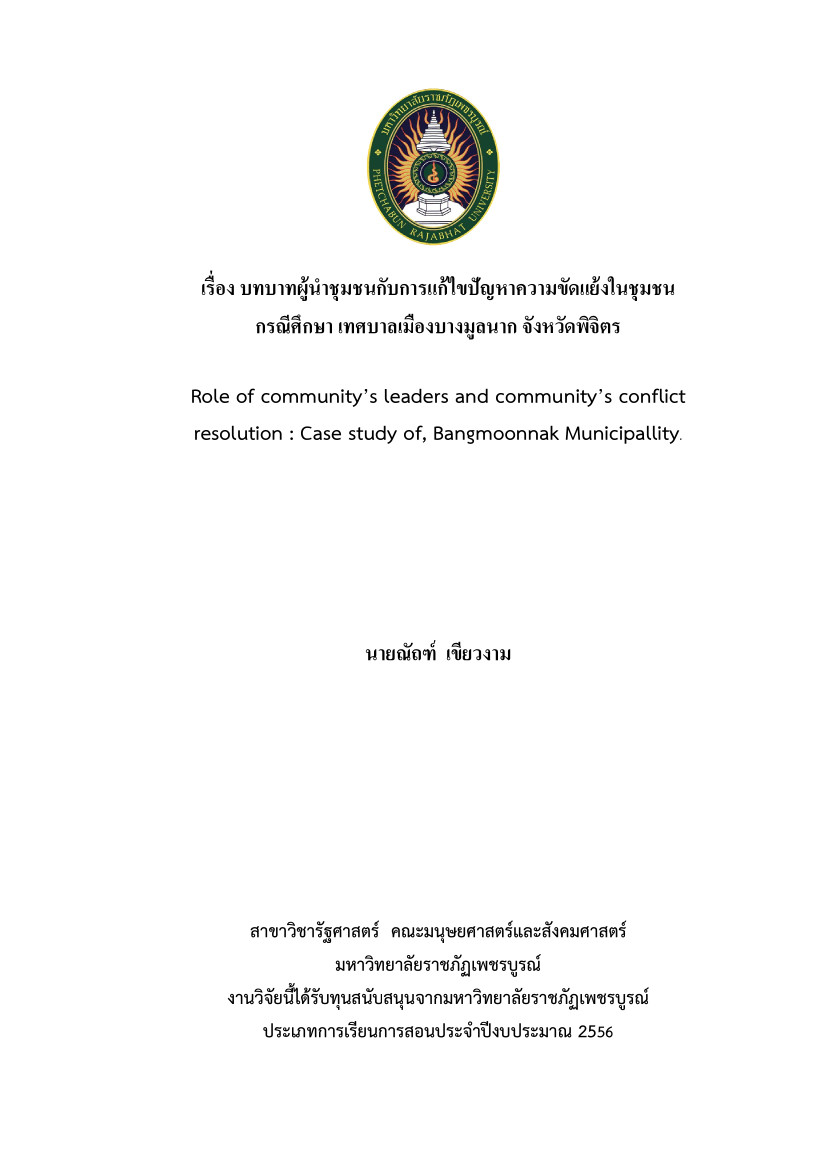วิจัย บทบาทผู้นำชุมชนกับการแก้ไขปัญหาความยัดแย้งในชุมชน กรณีศึกษา เทศบาลเมืองบงมูลนาก จังหวัดพิจิตร