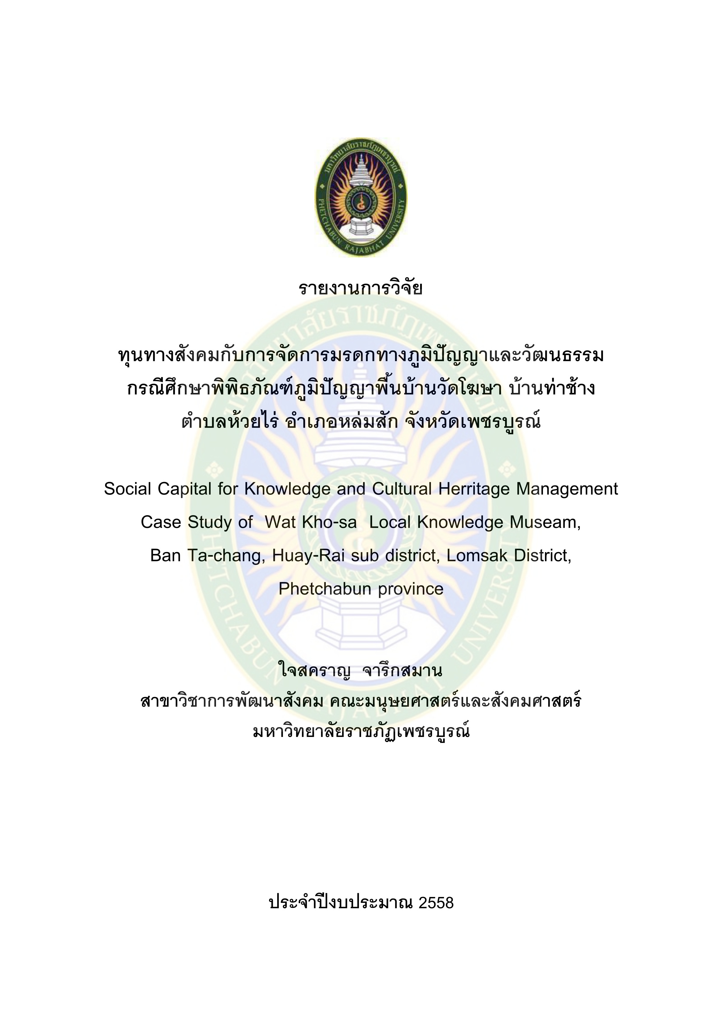 เกี่ยวกับ ทุนทางสังคมกับการจัดการมรดกทางภูมิปัญญาและวัฒนธรรมกรณีศึกษาพิพิธภัณฑ์ภูมิบ้านวัดโฆษา บ้านท่าช้าง ตำบลห้วยไร่ อำเภอหล่มสัก จังหวัดเพชรบูรณ์