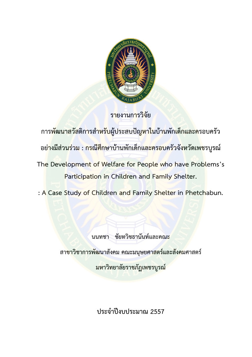 เกี่ยวกับ การพัฒนาสวัสดิการสำหรับผู้ประสบปัญหาในบ้านพักเด็กและครอบครัวอย่างมีส่วนร่วม กรณีศึกษาบ้านพักเด็กและครอบครัวจังหวัดเพชรบูรณ์