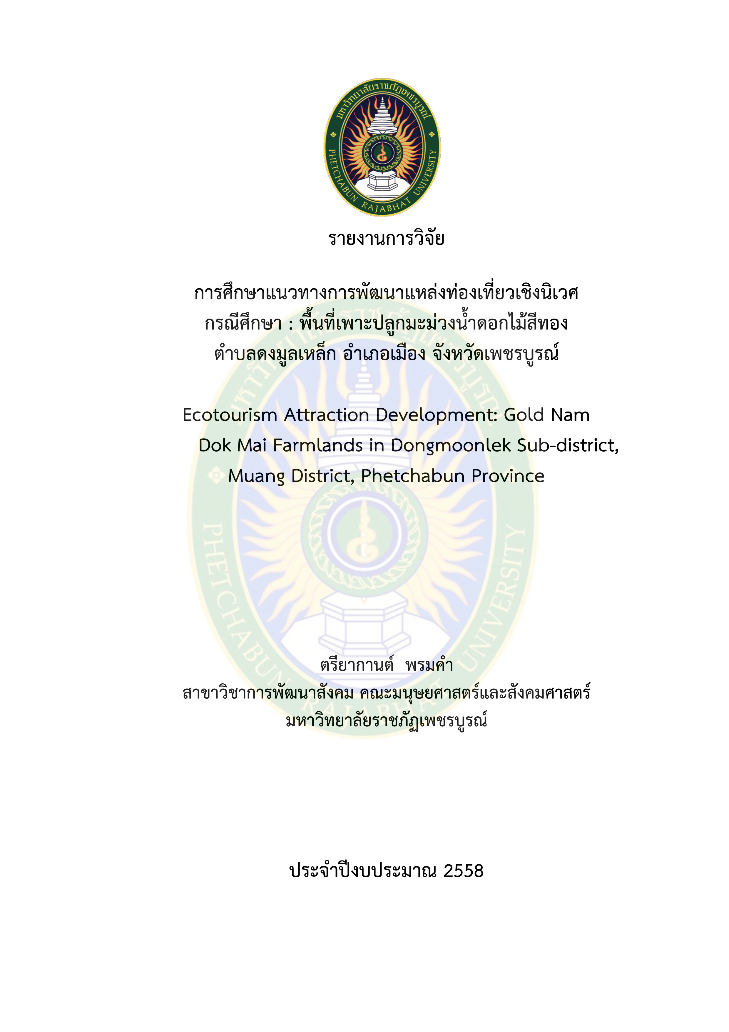 เกี่ยวกับ การศึกษาแนวทางการพัฒนาแหล่งท่องเที่ยวเชิงนิเวศ กรณีศึกษา พื้นที่เพาะปลูกมะม่วงน้ำดอกไม้สีทอง ตำบลดงมูลเหล็ก อำเภอเมือง จังหวัดเพชรบูรณ์