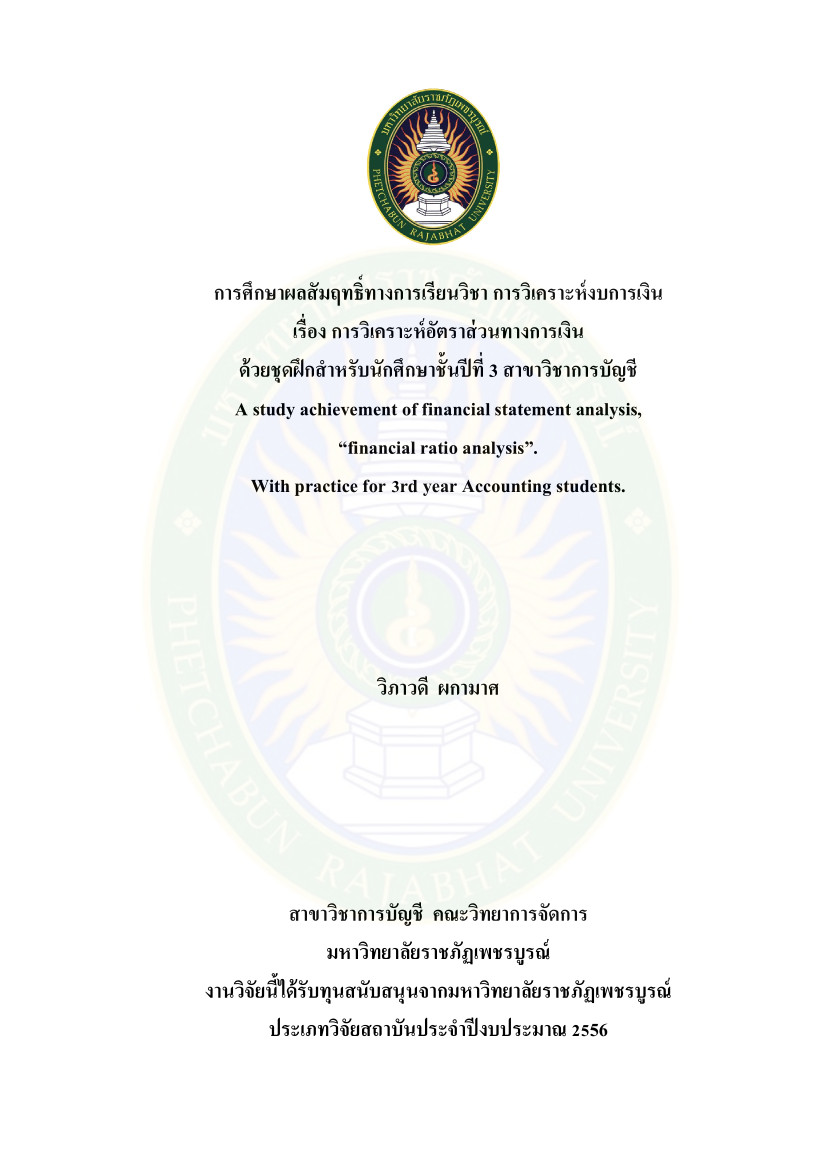 วิจัย การศึกษาผลสัมฤทธิ์ทางการเรียนวิชา การวิเคราะห์งบการเงิน เรื่อง การวิเคราะห์อัตราส่วนทางการเงินด้วยชุดฝึกสำหรับนักศึกษาชั้นปีที่ 3 สาขาวิชาการบัญชี