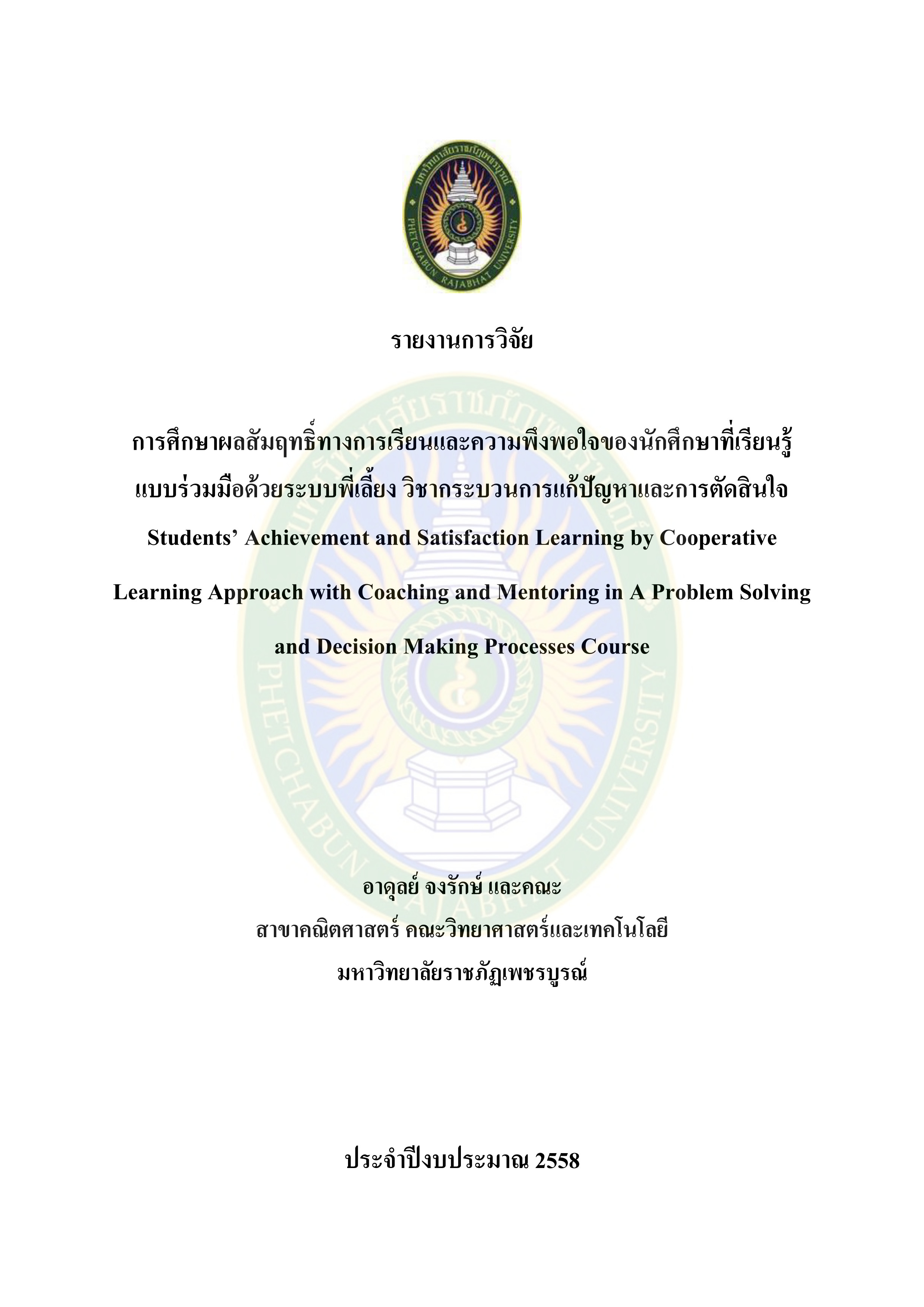 เกี่ยวกับ การศึกษาผลสัมฤทธิ์ทางการเรียนและความพึงพอใจของนักศึกษาที่เรียนรู้แบบร่วมมือด้วยระบบพี่เลี้ยง วิชากระบวนการแก้ปัญหาและการตัดสินใจ